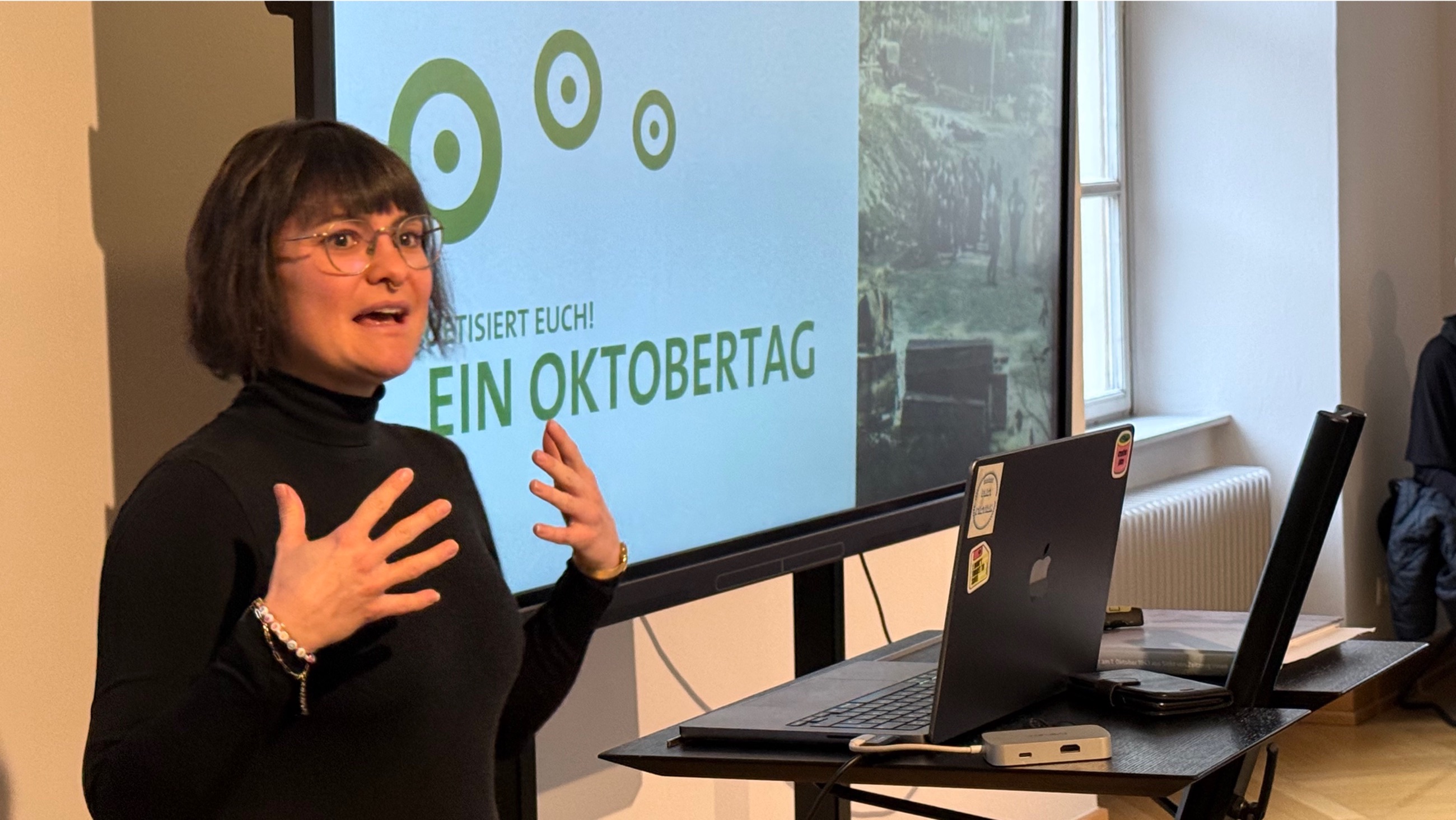 Ergänzend zur Publikation wurde der digitale Rundgang „Poetisiert Euch! Ein Oktobertag“ vorgestellt. Marilena Tumler von der Agentur i.appear präsentierte die Smartphone-App, die zentrale Schauplätze des Bombenabwurfs durch Audio, Texte und Bilder erlebbar macht – vom Antoniushaus bis zur ehemaligen Lehrerbildungsanstalt. Dieser multimediale Zugang soll besonders auch junge Menschen erreichen.