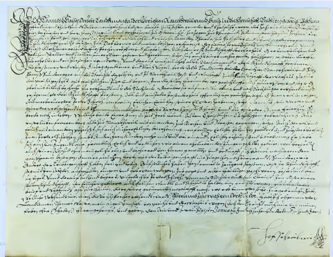 Eine Art früher Ausweis: Geburtsbrief (Brief = Urkun-de) des Peter Schick aus Rankweil, ausgestellt von Thomas Walser, Landammann des Gerichts Rankweil-Sulz; er bestätigte die ehelichen Geburt als Sohn von Christa Schick und Anna Frickin | StaF, Urk. 1070 | Foto © Dieter Petras