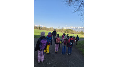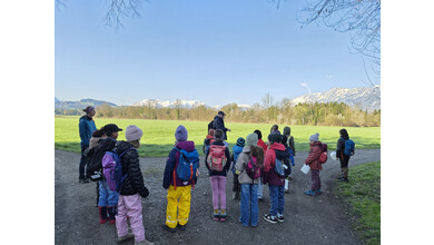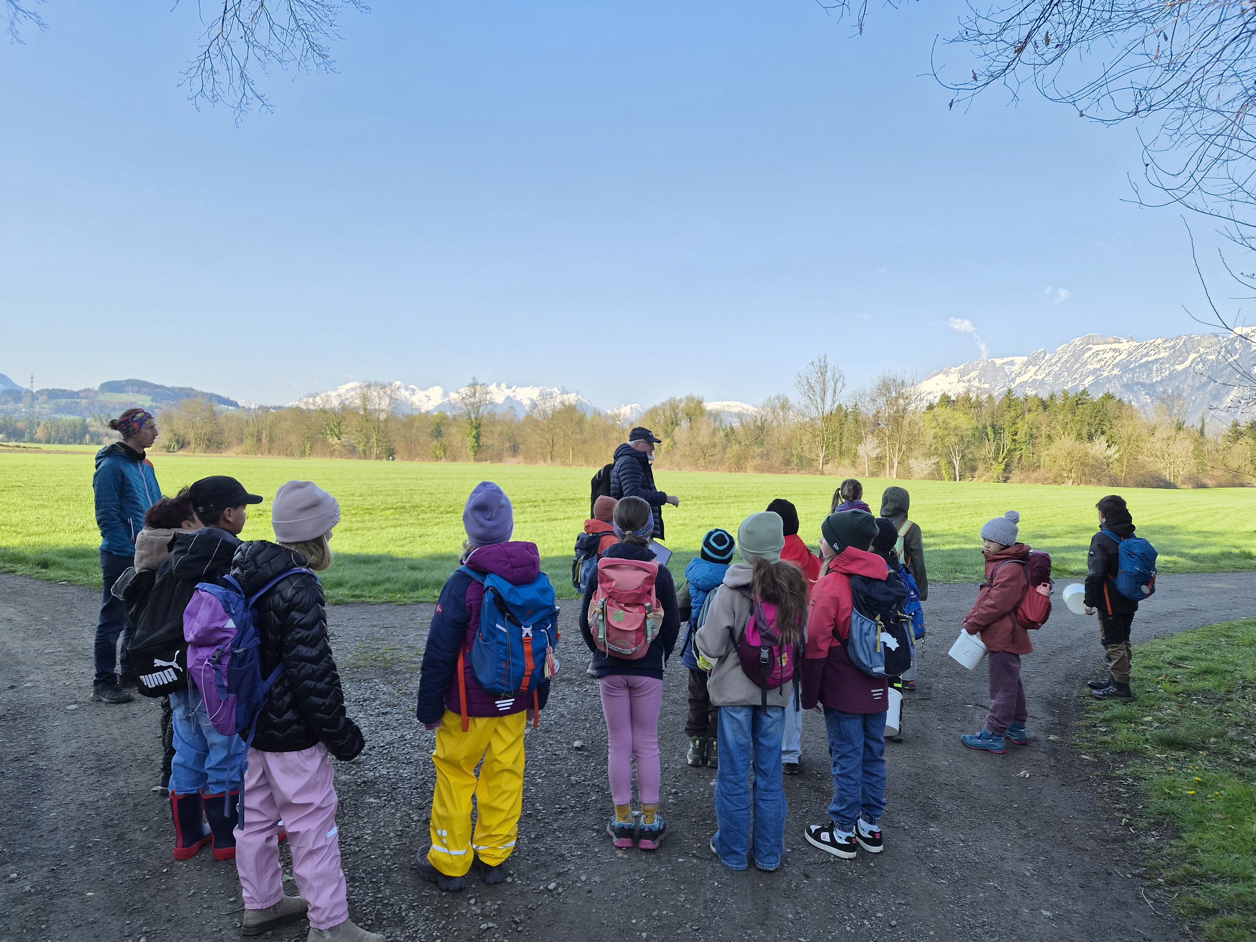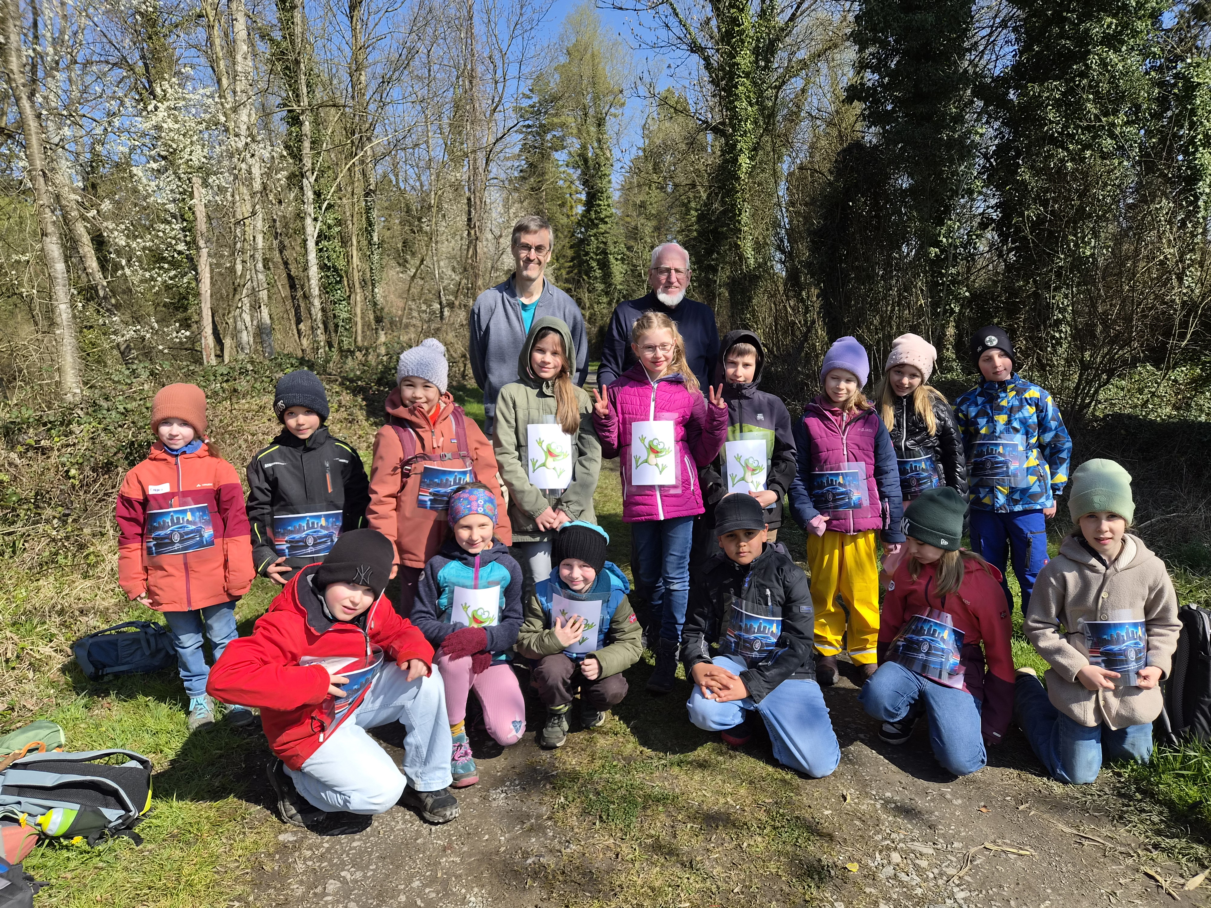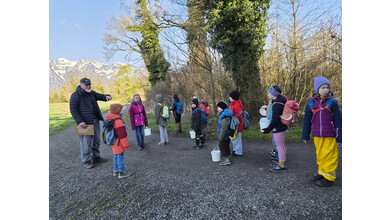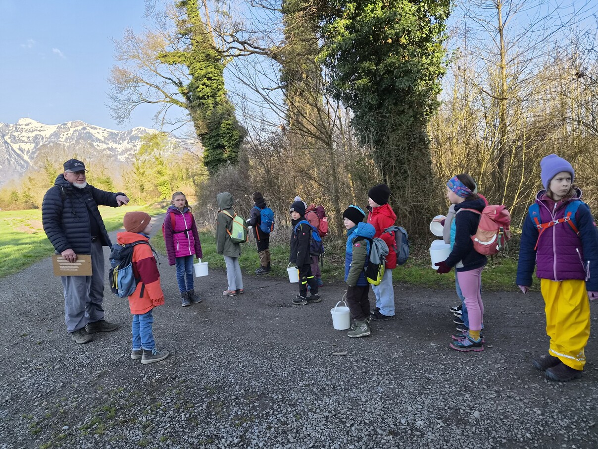 Jenny Lovisi, Abteilung Umwelt, Energie, Klima der Stadt Feldkirch und Dr. Richard Werner vom Bereich Natur und Umwelt der Rheticus-Gesellschaft empfingen die 15 gespannten Kinder. Mit zwei begleitenden Vätern und einer Fotografin wanderten sie in die Alten Rüttenen. Auf dem Weg dorthin wurden die Entdecker:innen bereits auf verschiedene Lebewesen aufmerksam und konnten einen der zwei Demo-Laubfrösche einmal in der Hand halten.. Sie schärften die Ohren für das morgendliche Vogel “Konzert“.