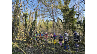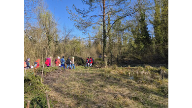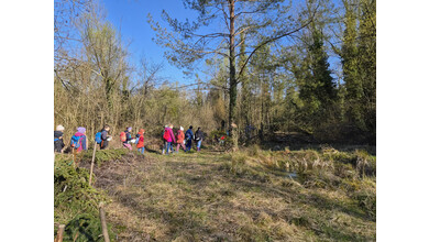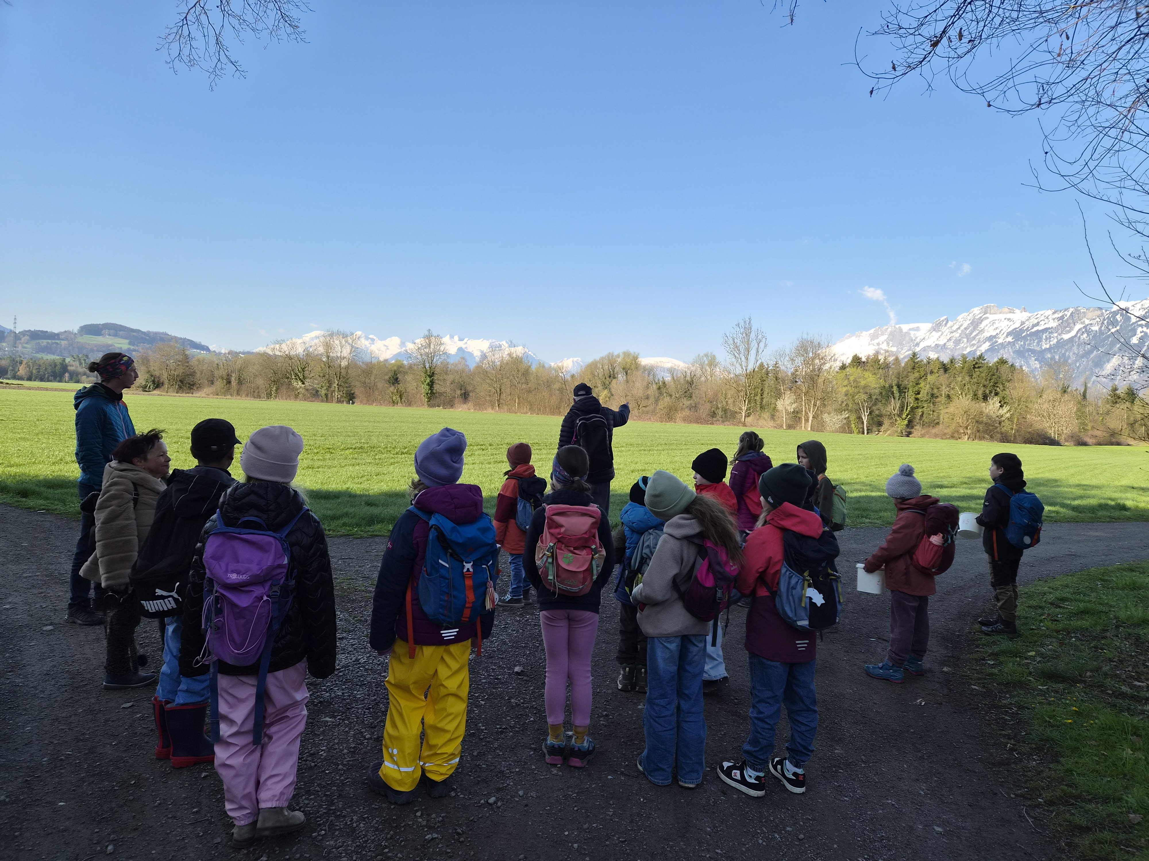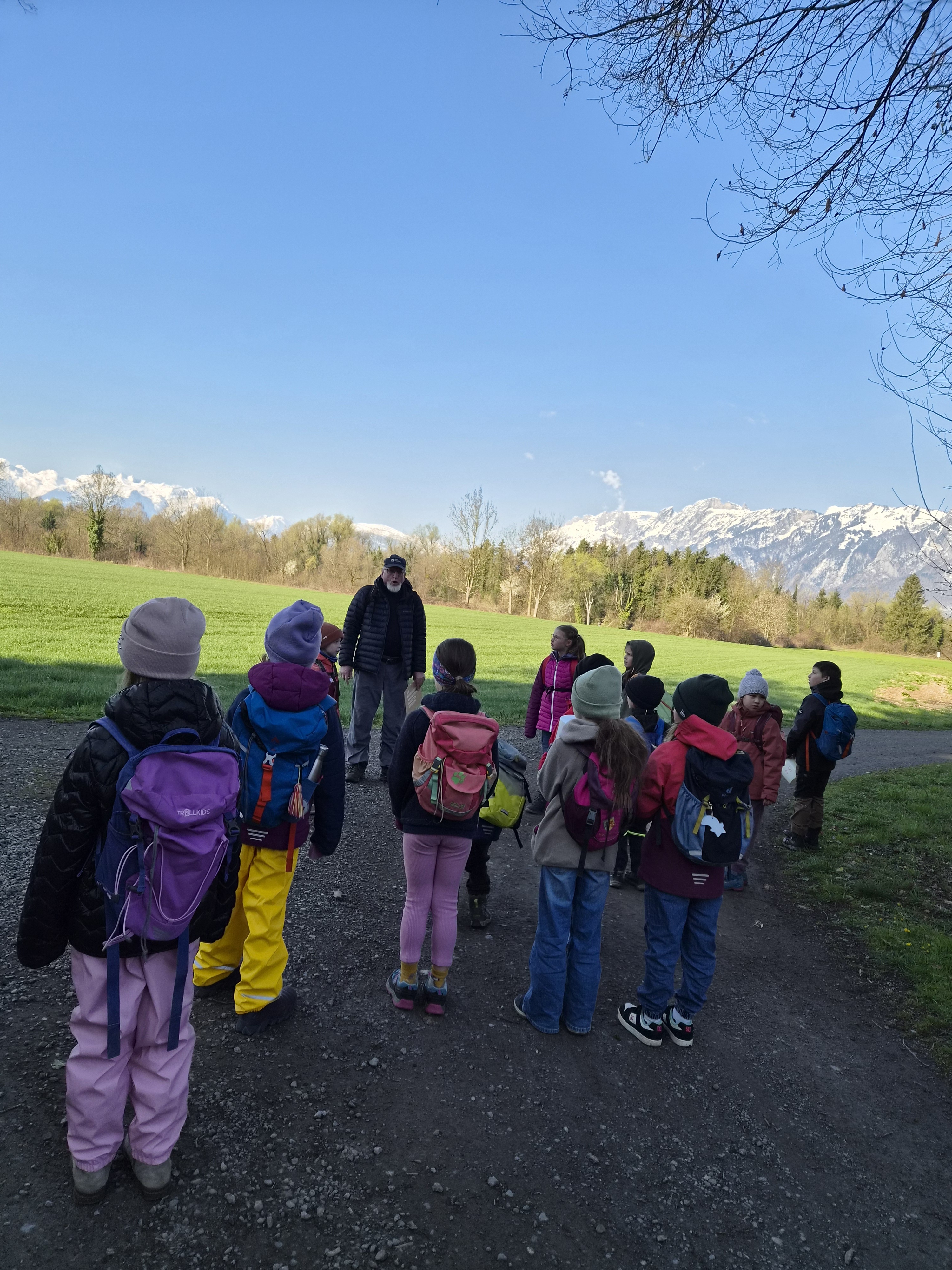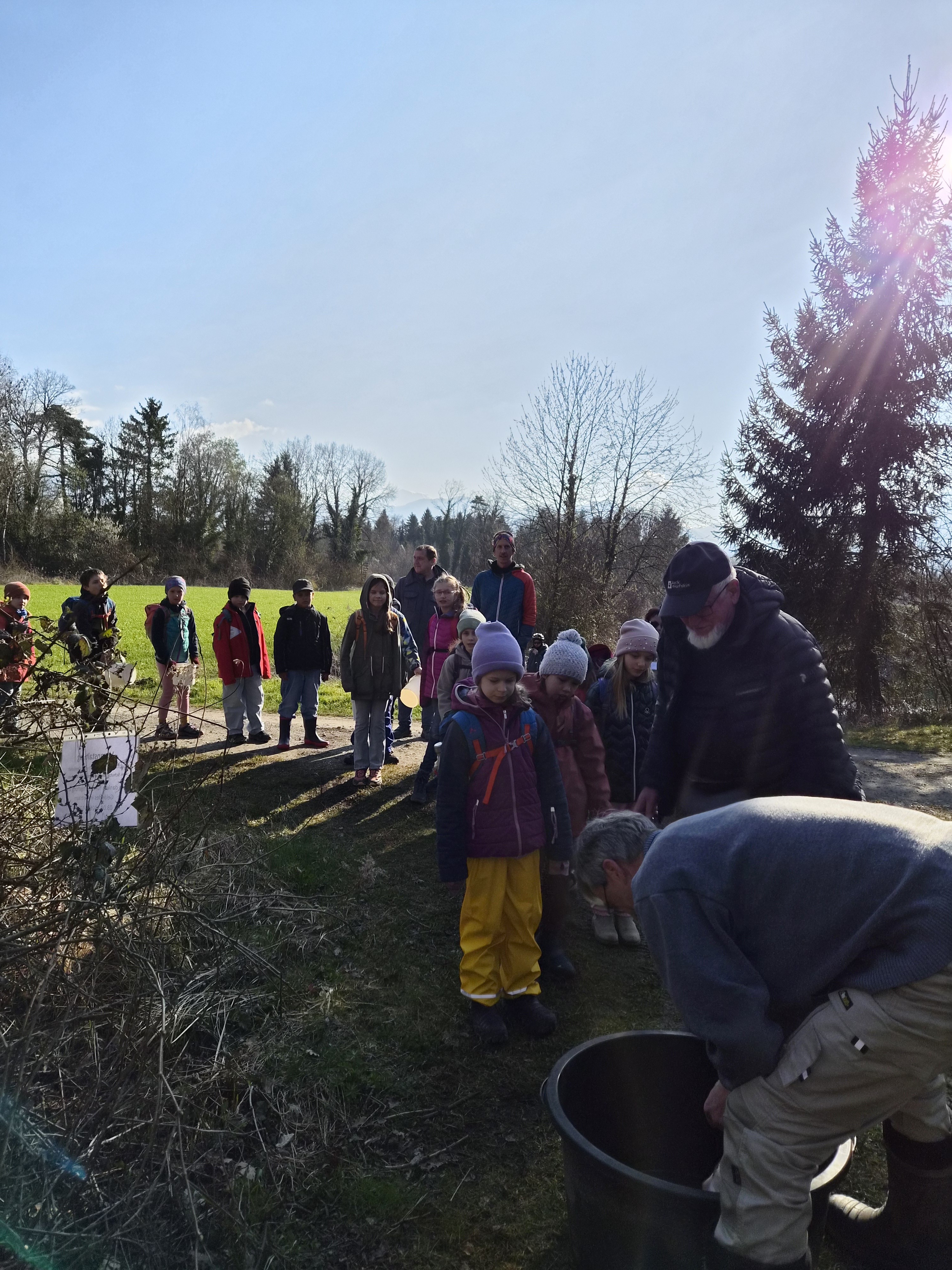 Jenny Lovisi, Abteilung Umwelt, Energie, Klima der Stadt Feldkirch und Dr. Richard Werner vom Bereich Natur und Umwelt der Rheticus-Gesellschaft empfingen die 15 gespannten Kinder. Mit zwei begleitenden Vätern und einer Fotografin wanderten sie in die Alten Rüttenen. Auf dem Weg dorthin wurden die Entdecker:innen bereits auf verschiedene Lebewesen aufmerksam und konnten einen der zwei Demo-Laubfrösche einmal in der Hand halten.. Sie schärften die Ohren für das morgendliche Vogel “Konzert“.