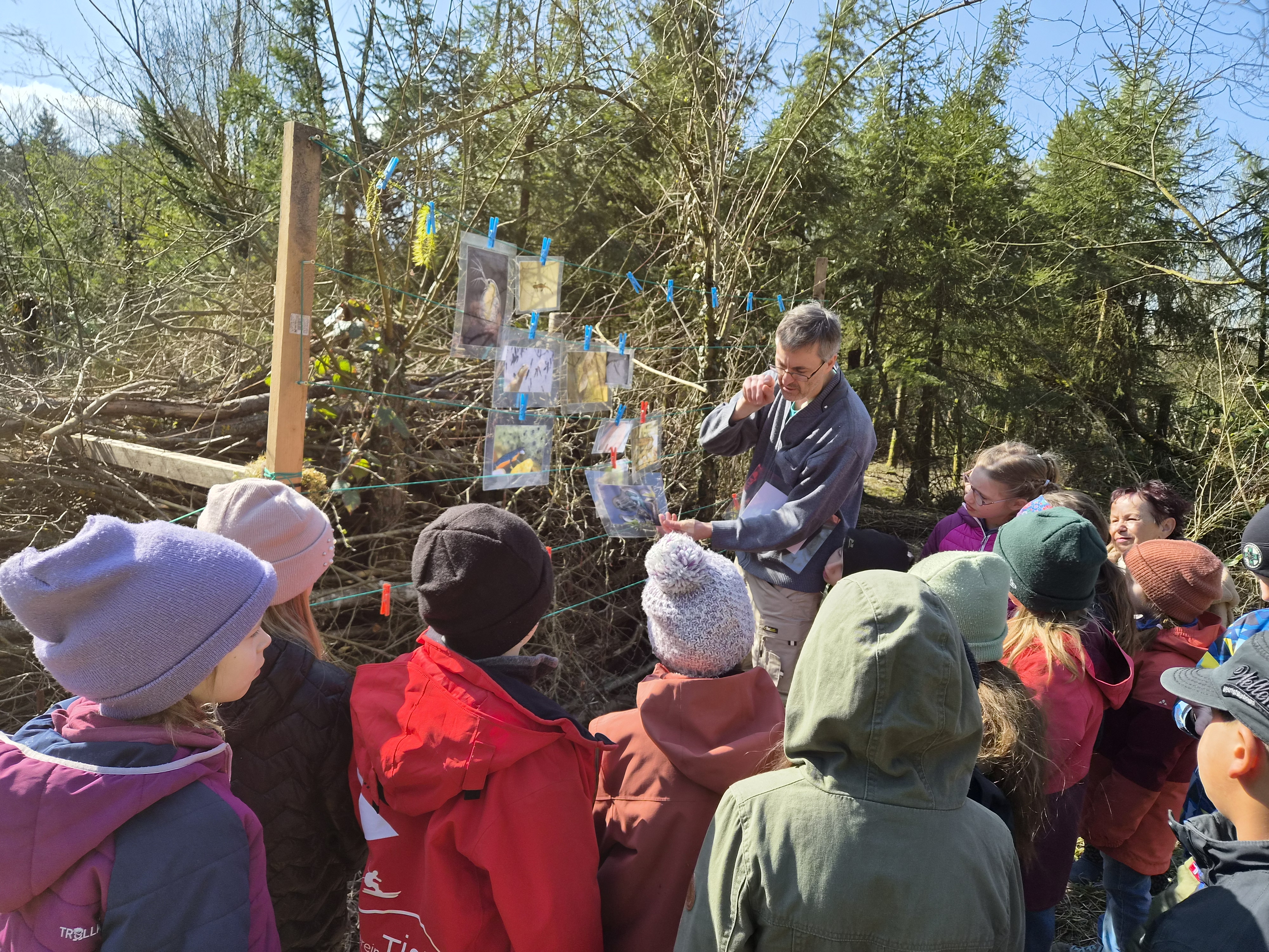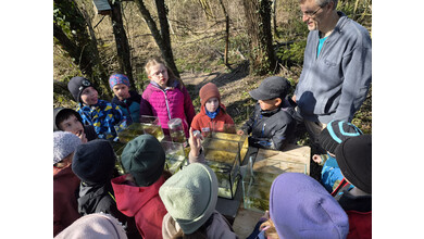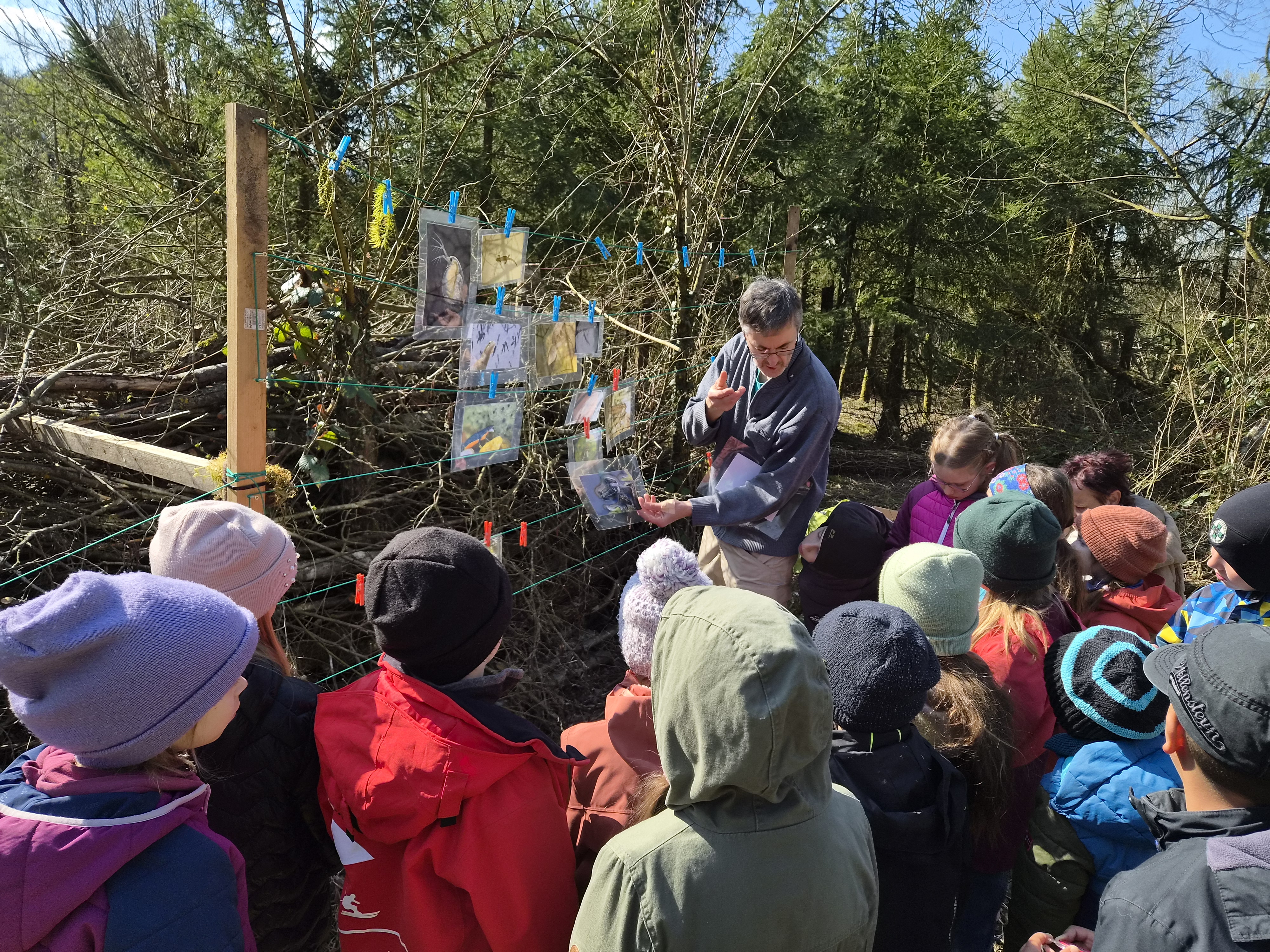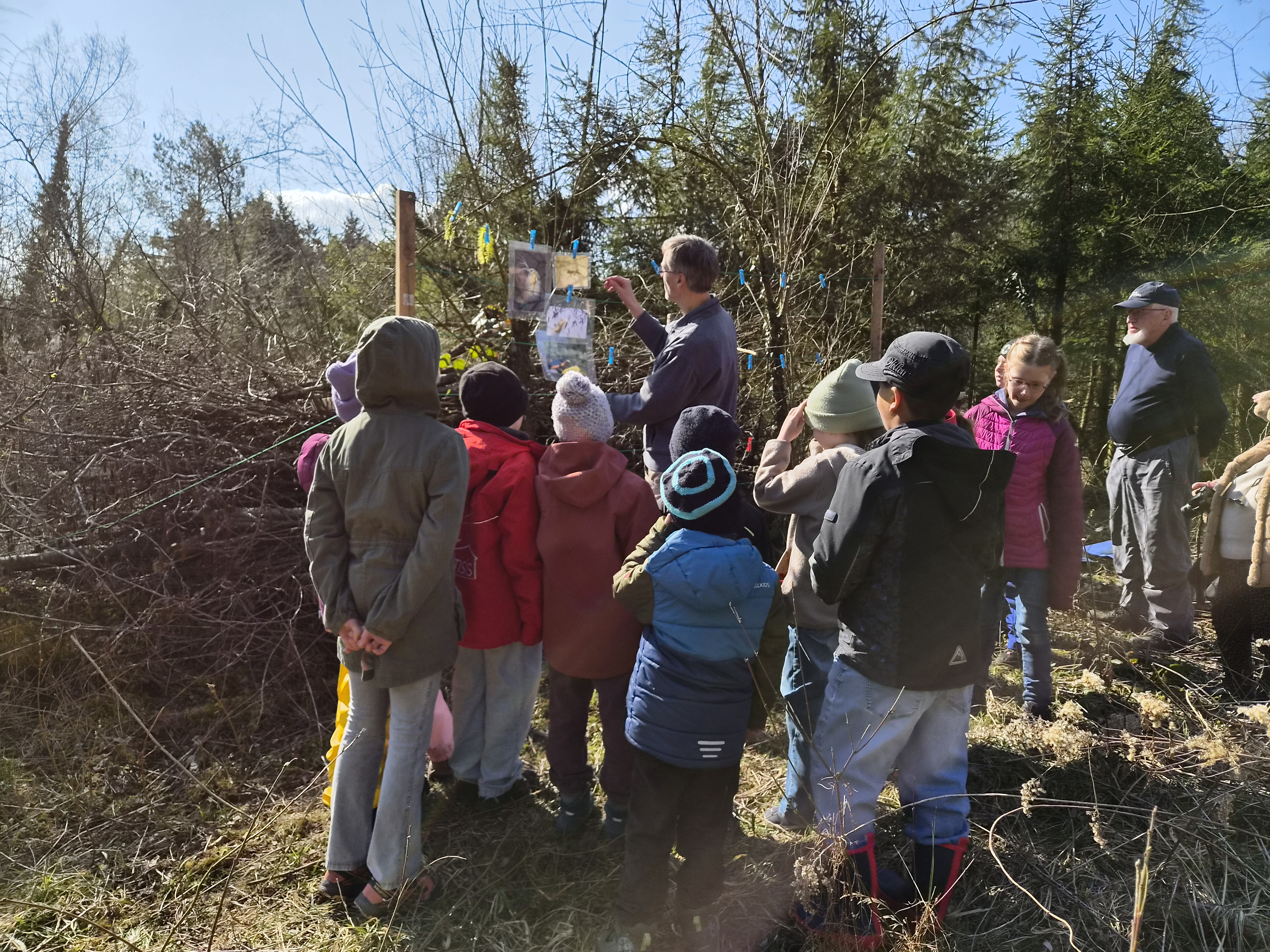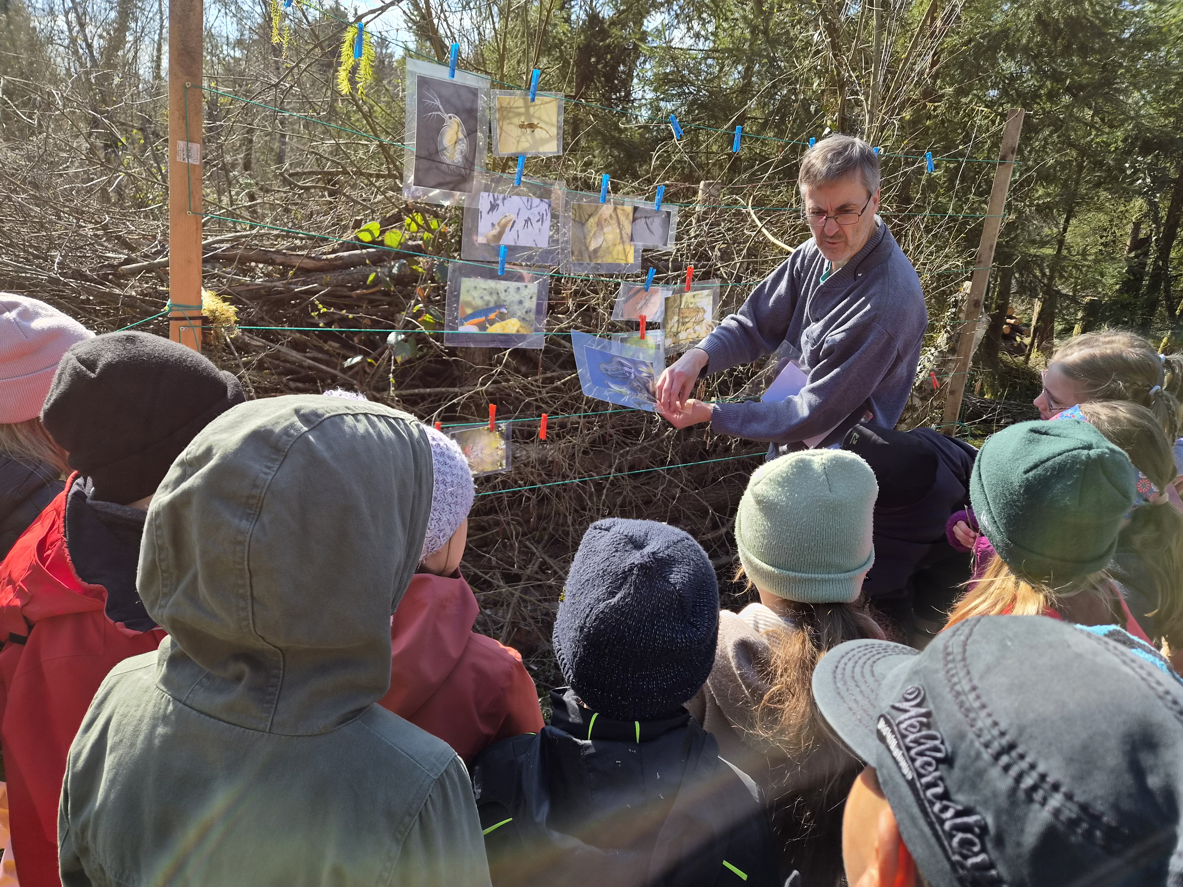 Gestärkt begab sich die junge Truppe in das Open-Air-Auditorium inmitten von Wiesen, Tümpeln und Büschen. Gemeinsam wurde versucht, das „Wer frisst wen am Teich?“ zu ergründen. Eine Wasserpflanze machte den Anfang, gefolgt von Wasserfloh, Froscheiern, Kaulquappen … Nach und nach folgten Bilder von immer größeren Tieren, wie Eidechse, Schlangen und Vögeln, die an einer „Tafel“ mit Kluppen aufgehängt wurden. Manchmal wird der Gejagte auch zum Jäger, wenn er es geschafft hat, groß genug zu werden… Angesichts der schnell fortschreitenden Zeit blieb die eine oder andere Frage für das nächste Mal im Jahr 2027 aufgespart.