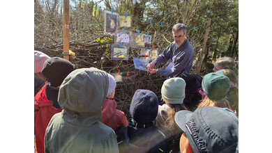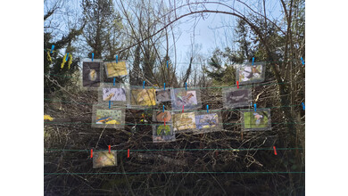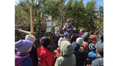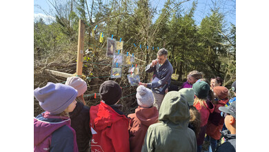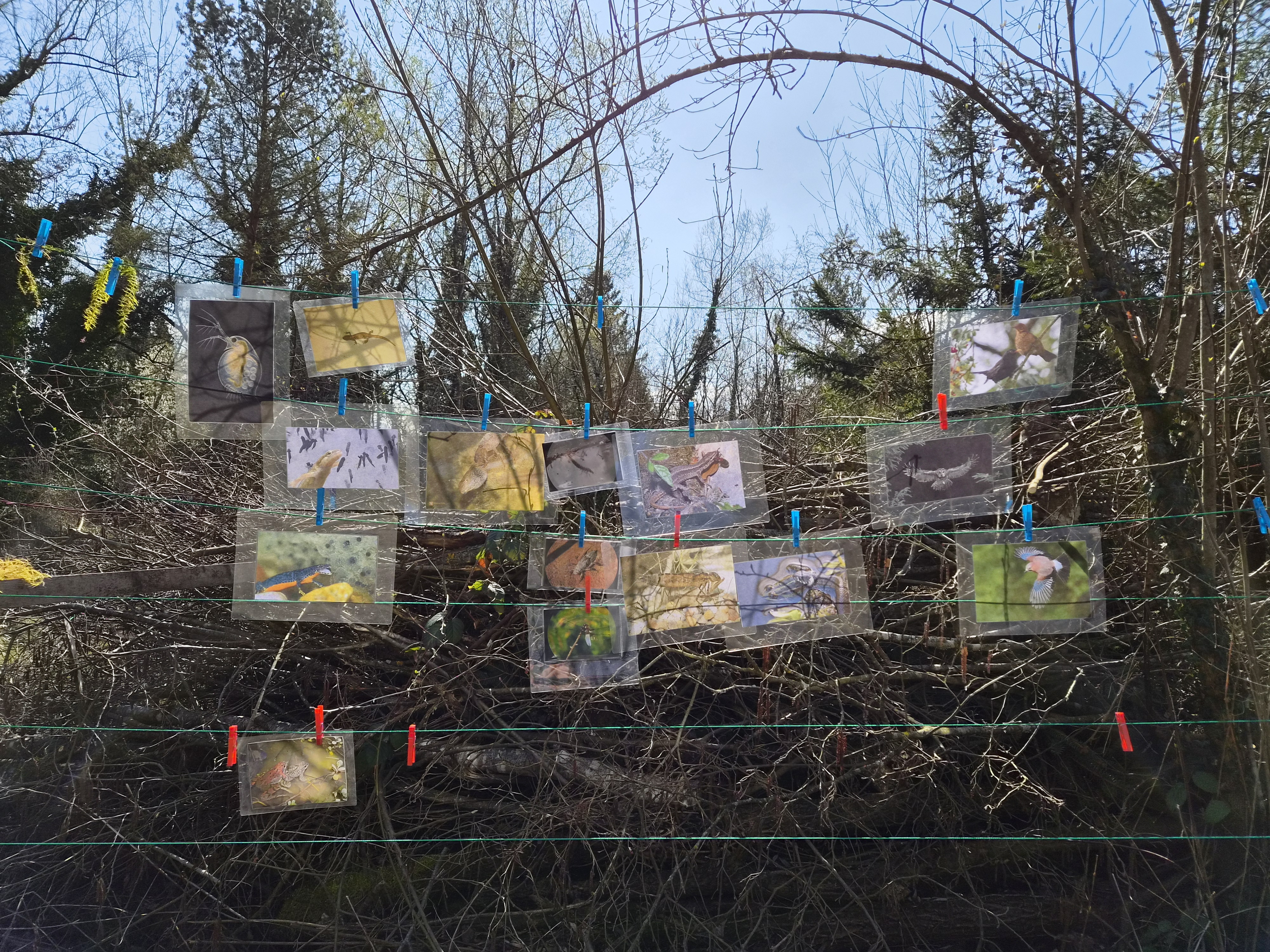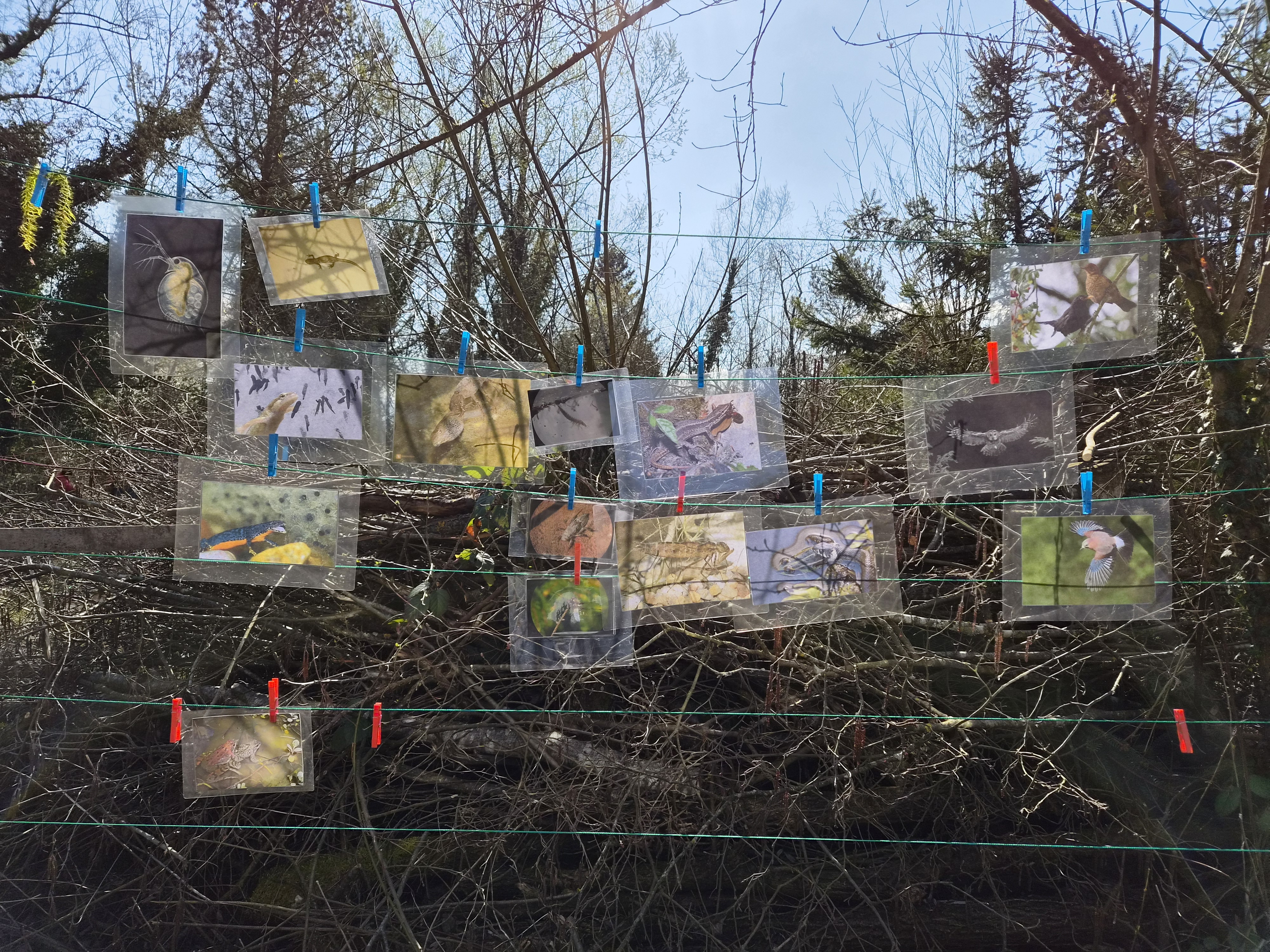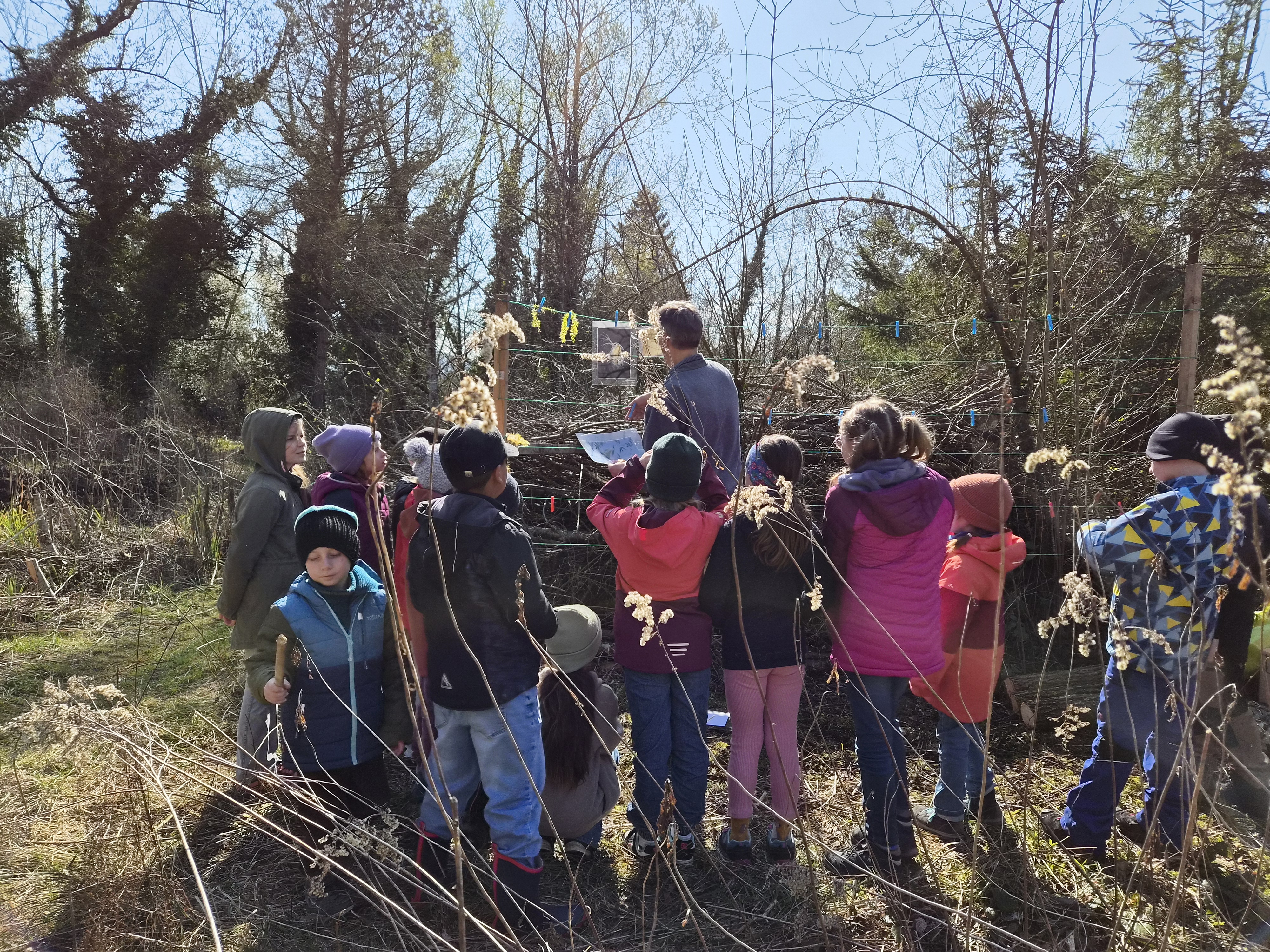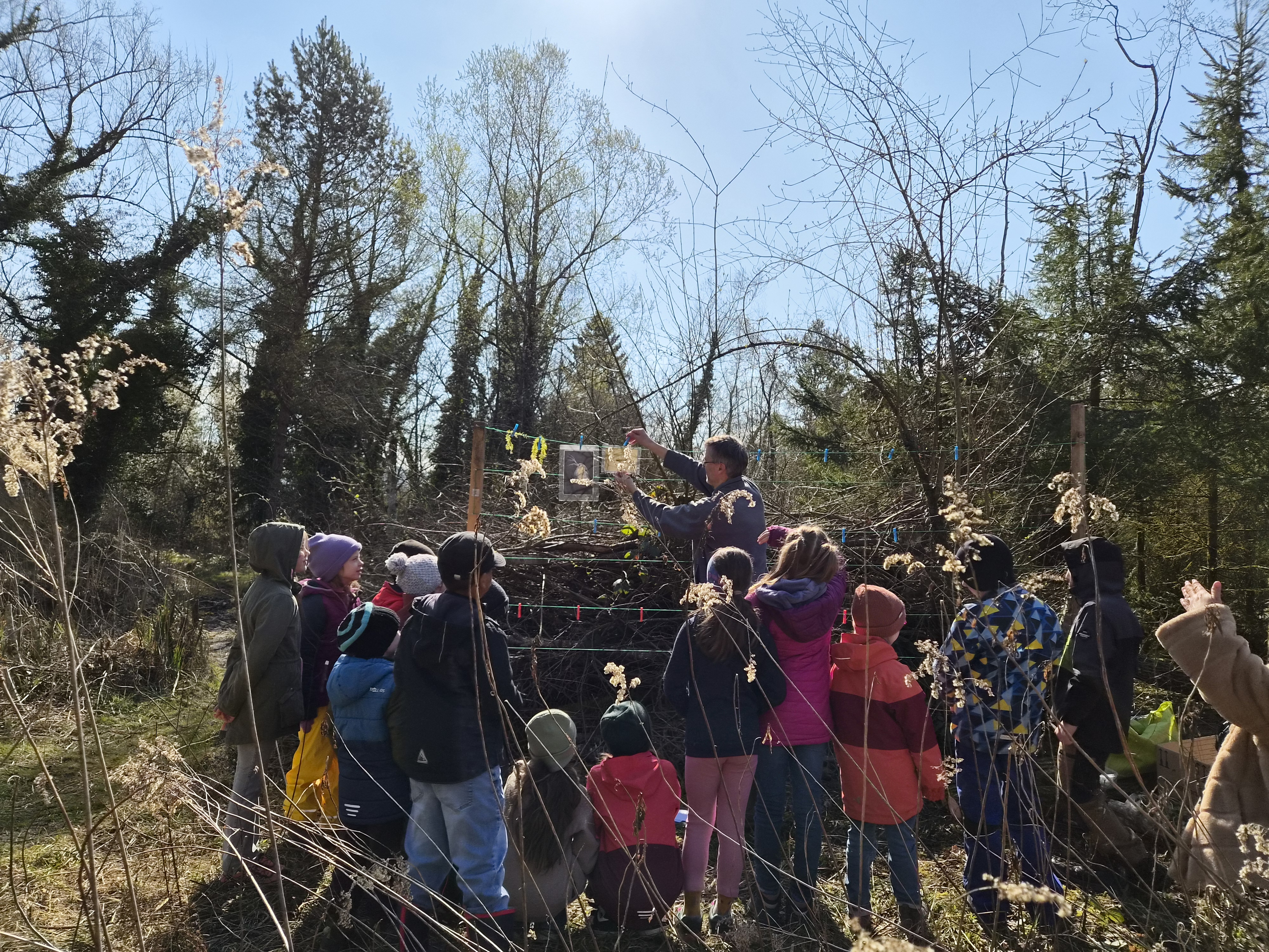 Gestärkt begab sich die junge Truppe in das Open-Air-Auditorium inmitten von Wiesen, Tümpeln und Büschen. Gemeinsam wurde versucht, das „Wer frisst wen am Teich?“ zu ergründen. Eine Wasserpflanze machte den Anfang, gefolgt von Wasserfloh, Froscheiern, Kaulquappen … Nach und nach folgten Bilder von immer größeren Tieren, wie Eidechse, Schlangen und Vögeln, die an einer „Tafel“ mit Kluppen aufgehängt wurden. Manchmal wird der Gejagte auch zum Jäger, wenn er es geschafft hat, groß genug zu werden… Angesichts der schnell fortschreitenden Zeit blieb die eine oder andere Frage für das nächste Mal im Jahr 2027 aufgespart.