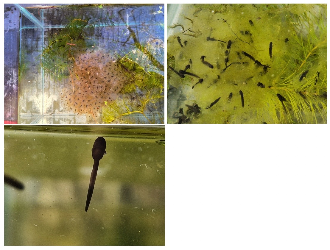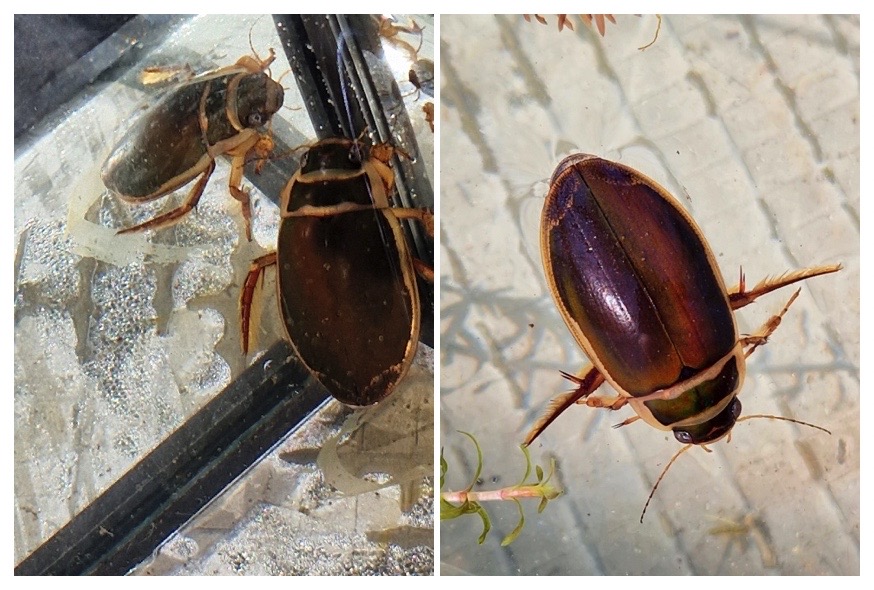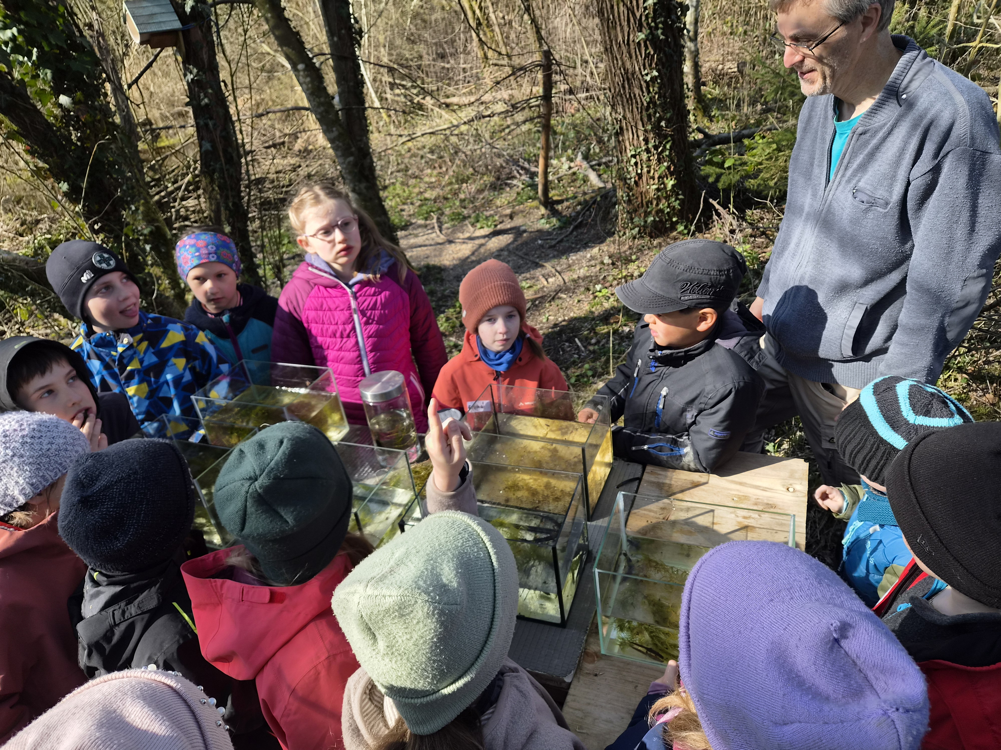 Nach einer verdienten Pause kam ein Highlight für die Entdecker:innen: In mehreren vorbereiteteten Aquarien konnten die Kinder Wasserdrachen-ähnelnde Molche, Eipakete und Kaulquappen von Fröschen bestaunen. Markus Stolze vermittelte den Kindern einiges über Frosch, Molch & Wasserkäfer. Sie erfuhren, wie die Molchpapas für die Molchmamas tanzen, um die Hochzeit zu beginnen. Die nebenan ausgestellten Gelbrandkäfer und Ruderwanzen, die diese gern fressen, wurden mit großem Respekt bestaunt und warfen viele neugierige Fragen auf. Wie fühlt sich die Kaulquappe, wenn sie vom Wasserkäfer verspeist wird? Wie schmerzhaft ist es, wenn einen die Wasserwanze pikt?