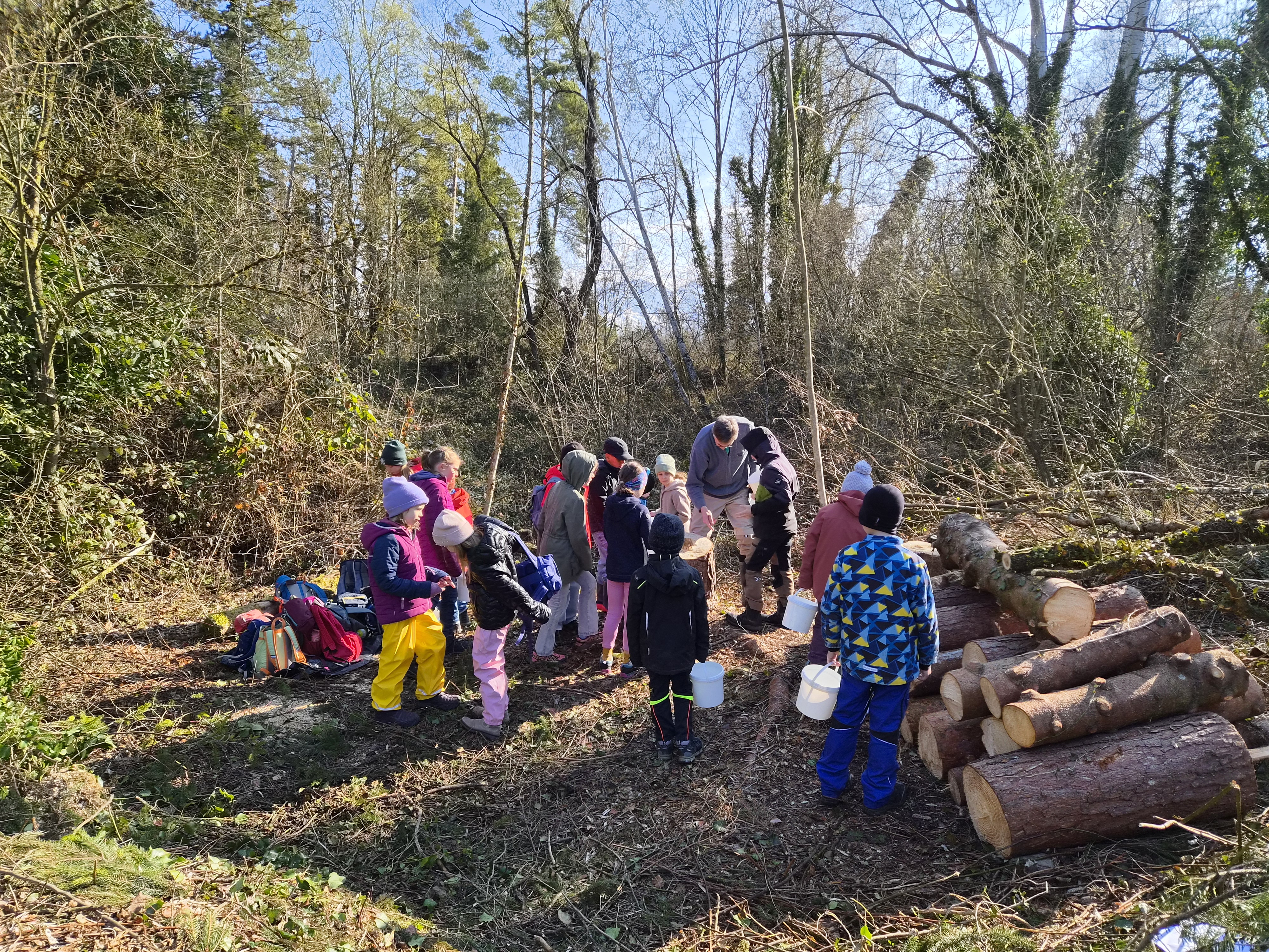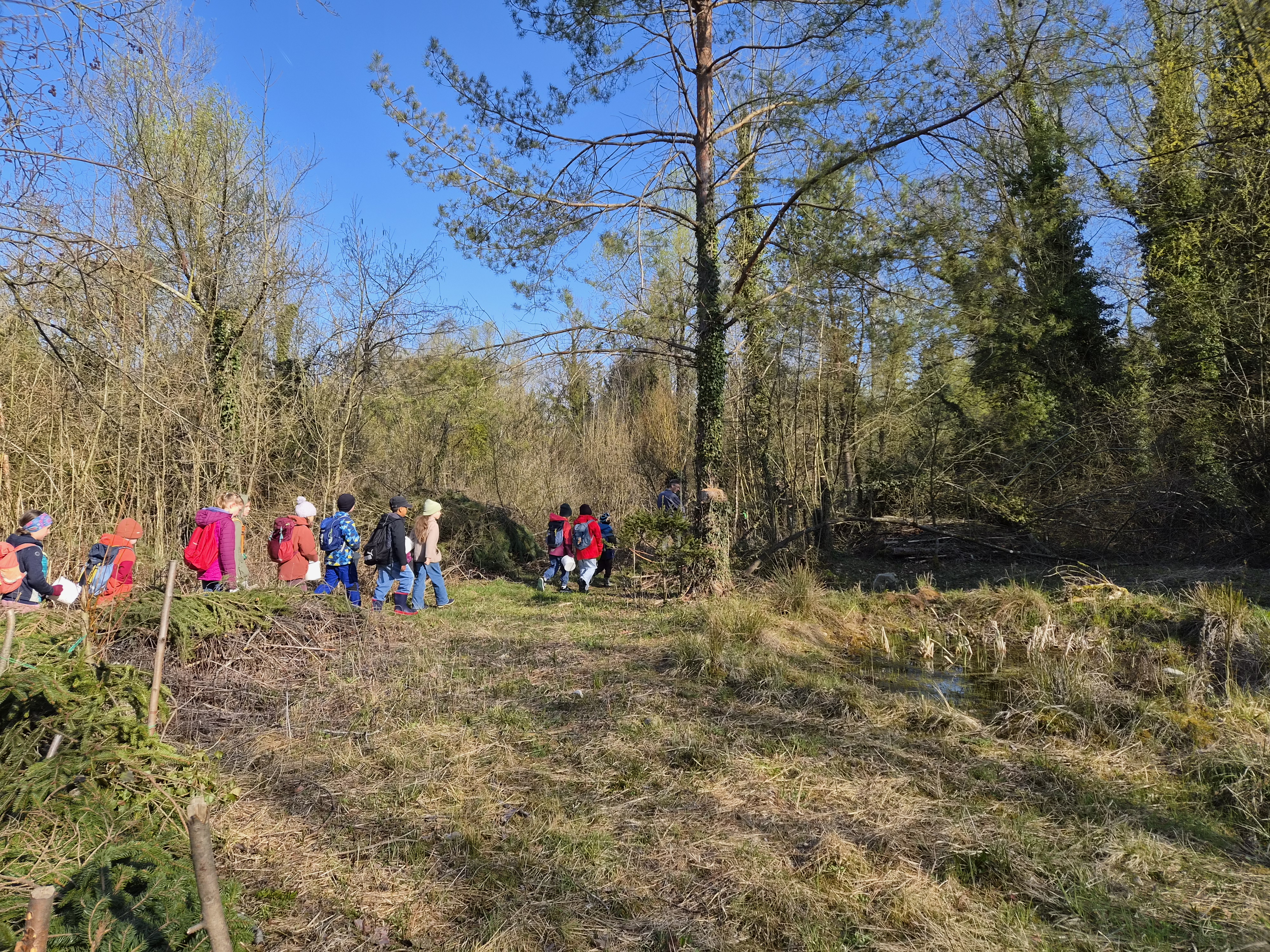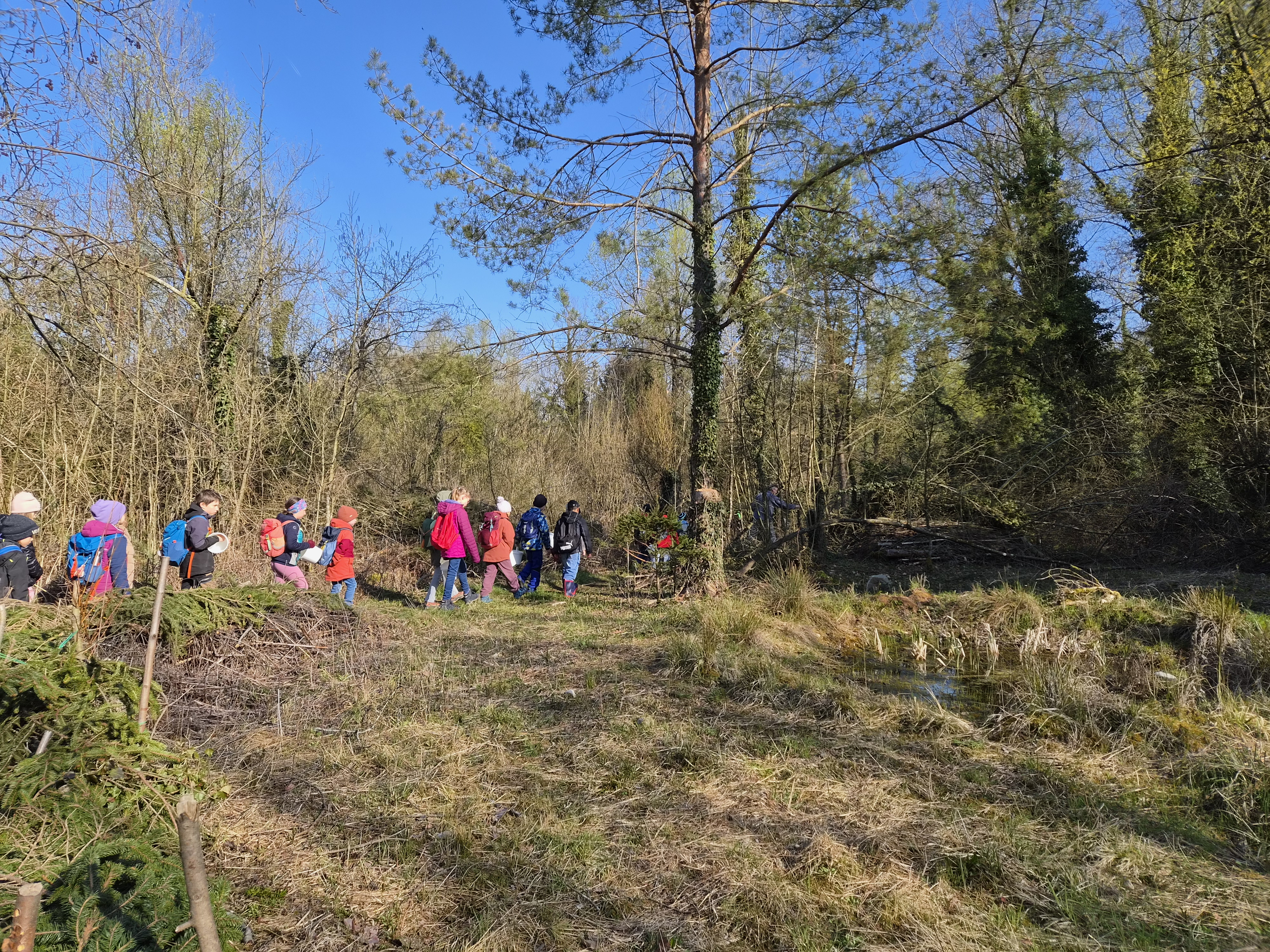 Dann ging es weiter in das Biotop hinein. Hier wurde von den Mädels und Buben sofort tatkräftig mitangepackt. Sie bildeten eine Eimerkette, um einen austrocknenden Tümpel wieder mit Wasser zu füllen und den Froschbabys („Kaulquappen“) darin das Leben zu retten. Etwa 30 Eimer mit 2 Liter Wasser wurden von Hand zu Hand gereicht und in den Teich geleert. Geschafft – Rettung geglückt!