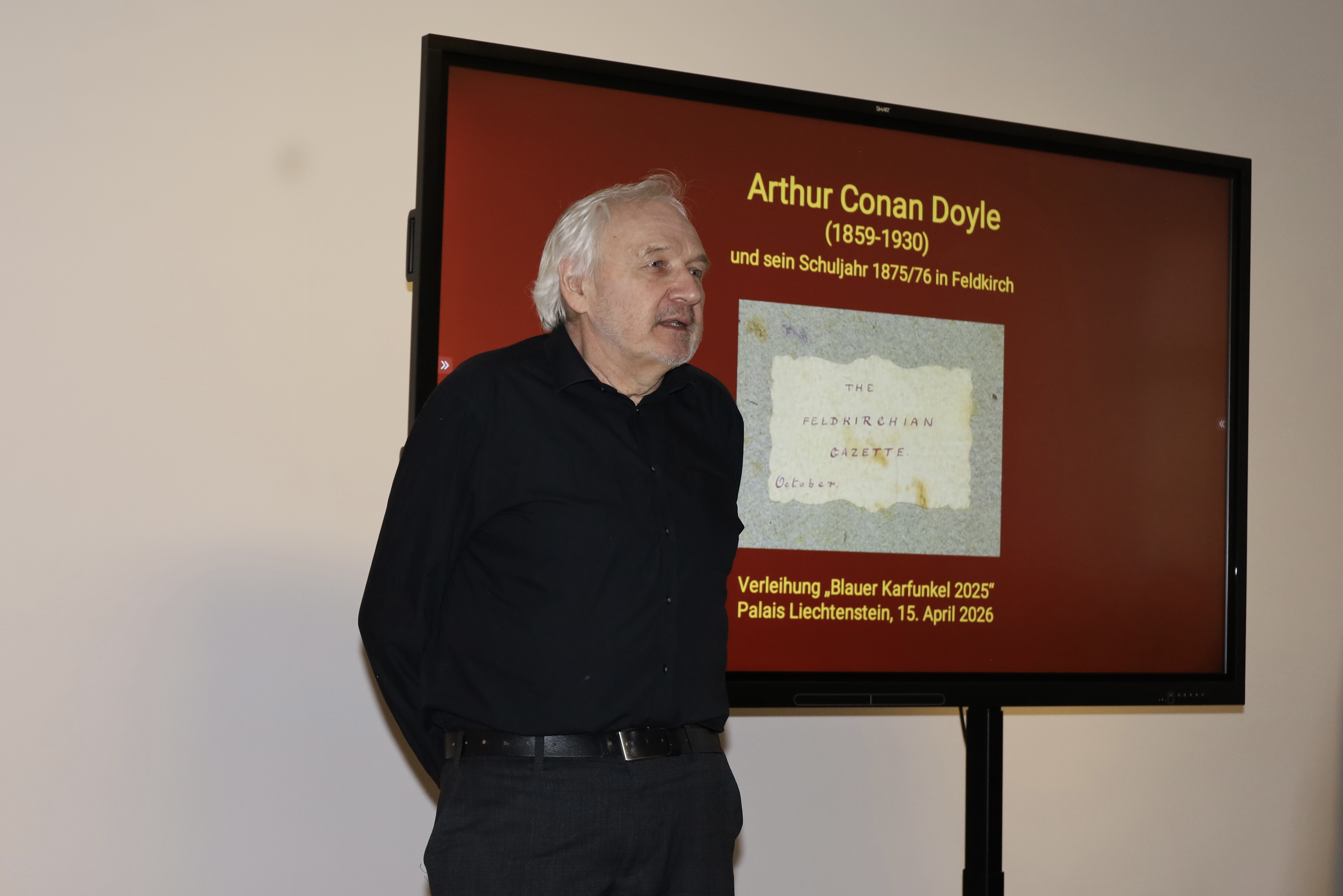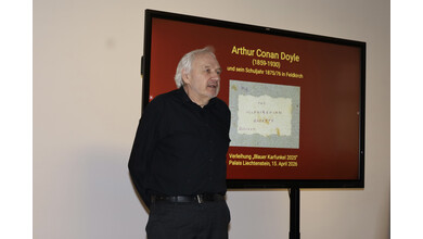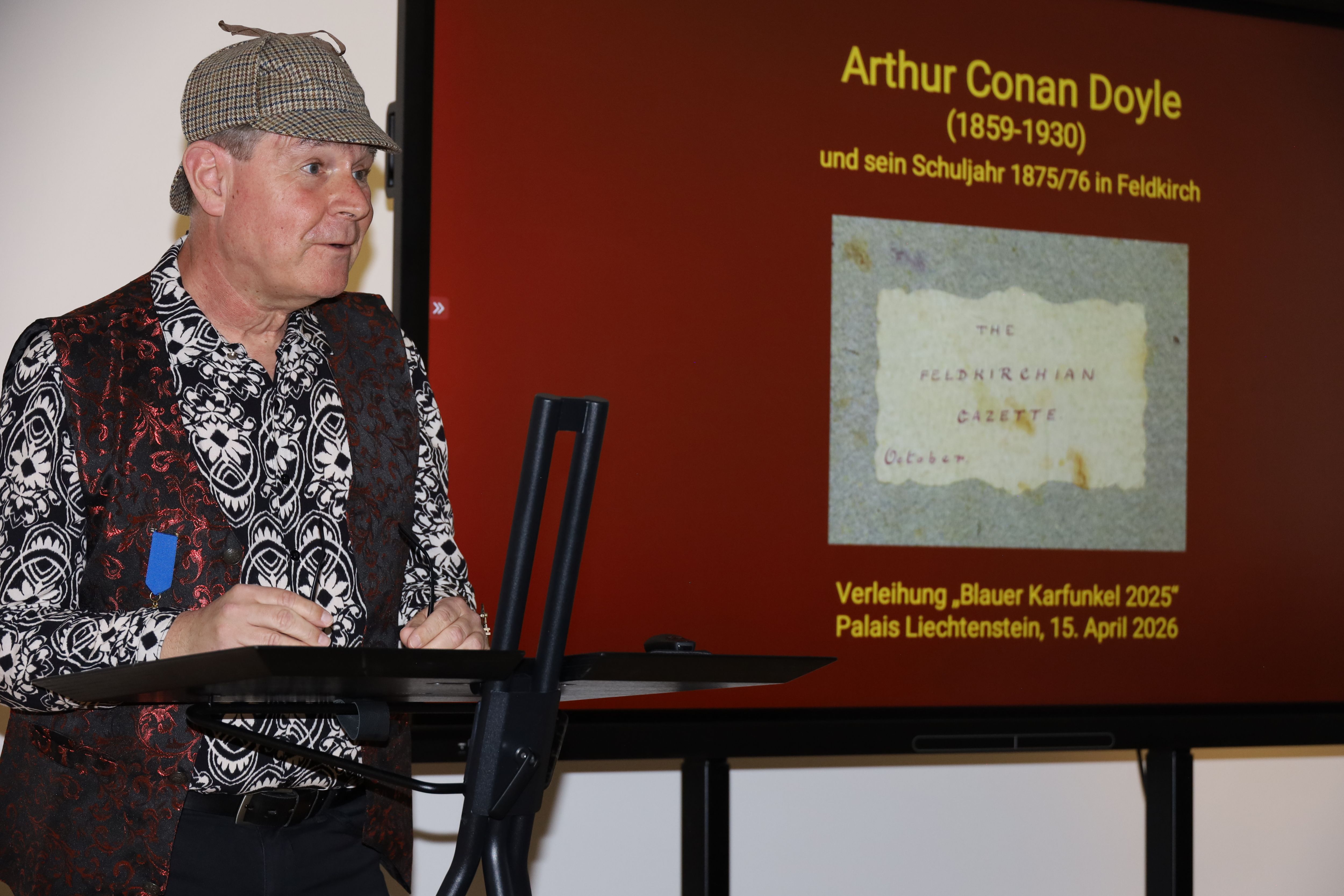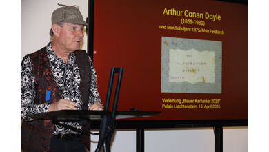 Kulturamtsleiterin Maria Simma durfte am 15. April 2026 zahlreiche Kulturinteressierte im Palais Liechtenstein begrüßen. Anlass war die Ehrung unseres langjährigen Vereinsmitglieds: Philipp Schöbi wurde von der Deutschen Sherlock Holmes Gesellschaft mit der Auszeichnung „Blauer Karfunkel 2025“ gewürdigt.