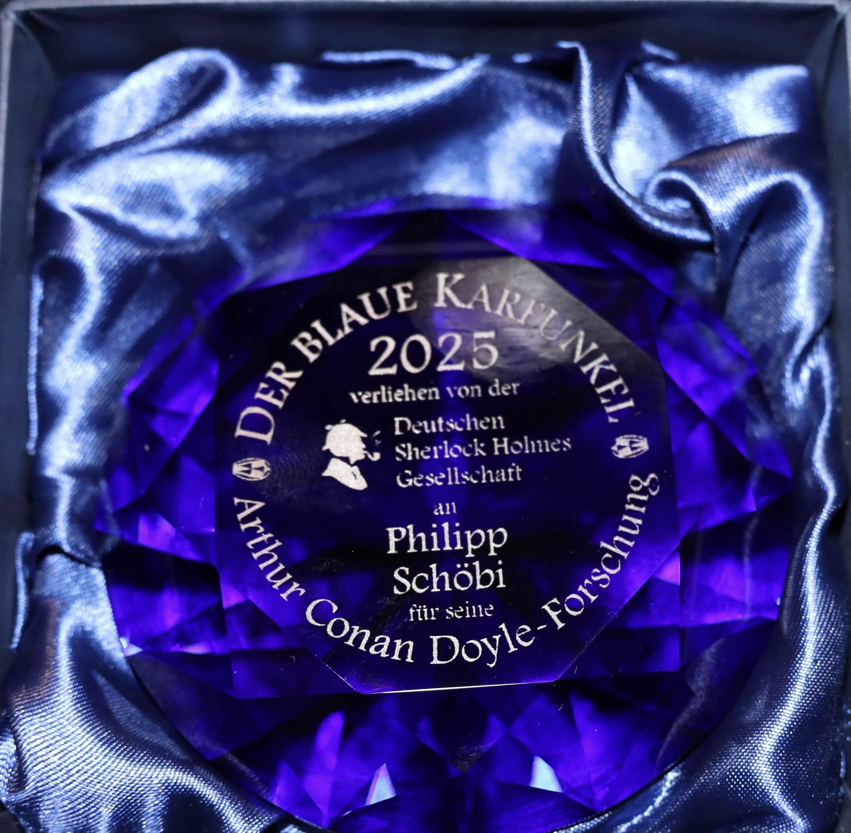 Der „Blaue Karfunkel“ geht auf die Sherlock-Holmes-Erzählung „The Adventure of the Blue Carbuncle“ zurück. Die Geschichte zählt zu den bekanntesten Fällen des Meisterdetektivs und steht sinnbildlich für Spürsinn und Entdeckungsfreude – Eigenschaften, die auch Schöbis wissenschaftliche Arbeit auszeichnen.