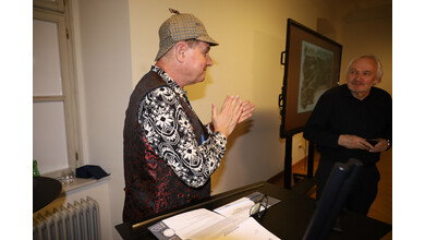 Zu Beginn der Veranstaltung hielt Philipp Schöbi einen reich bebilderten und lebendigen Vortrag. Mit ausgewählten „Rosinen“ aus seinem umfangreichen Fundus begeisterte er das Publikum und gewährte spannende Einblicke sowohl in seine Forschungsarbeit als auch in die frühen Anfänge von Doyles schriftstellerischem Schaffen.